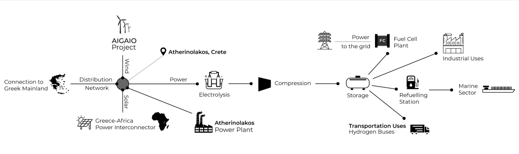 CRAVE-H2 is paramount in order to pilot the hydrogen market in Crete and Greece, and is located in a strategic location, where the leading partner EUNICE is developing the first Greek (European) African electricity distribution interconnection, allowing for cheap PV power to be introduced into the Greek (and via that to the European) electricity and hydrogen market. The location of the main hydrogen production is the port of Atherinolakos (in the southeastern part of Crete) and will allow the future deployment of hydrogen ship transportation as well as its use as maritime fuel. The scope of this topic is to develop, deploy and demonstrate a hydrogen valley, with the objective of also increasing its capacity in the future.